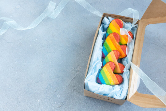 Heart shaped cookies painted with LGBT rainbow flag in gift box.