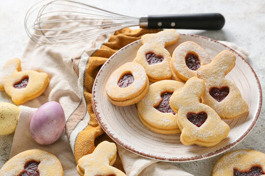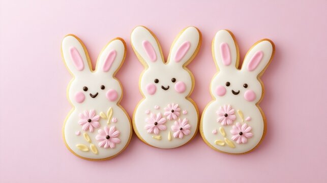 Happy Easter. Multicolored pastel easter cookies on a pink background. Bunny