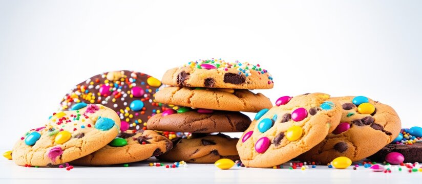 A variety of multicolored cookies adorn a white background accompanied by chocolate chips and vibrant candies A bottle of milk rests nearby There is ample copy space for text making it suitable for h