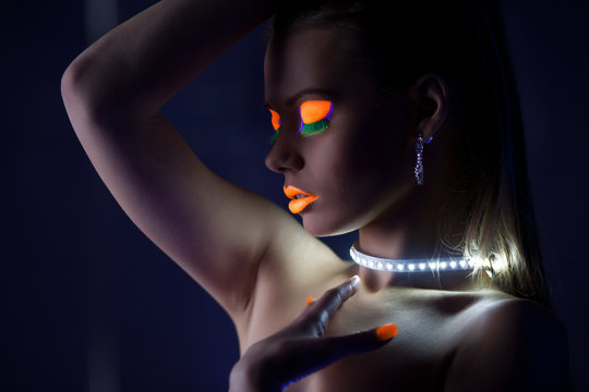 Empty scene background, abstract background with multicolored bokeh and neon lights. Silhouettes of tropical leaves