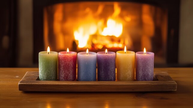 A collection multicolored votive candles placed on a wooden tray, with a warm fire crackling in the fireplace