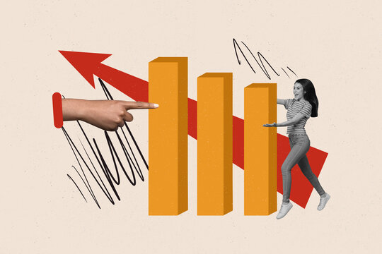 Collage image of arm point finger mini black white effect girl growing stats graphs arrow upwards isolated on painted background