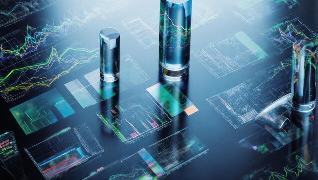 A colorful 3D sphere with multicolored nodes on a background of graphs and charts