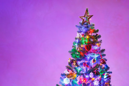 Christmas tree with multicolor led lights and purple copy-space background