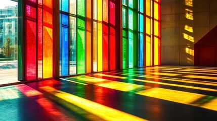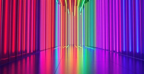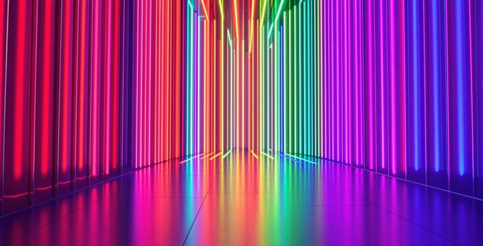 Colorful neon vertical and horizontal light beams in vibrant hues on a glossy reflective surface. Futuristic and dynamic energy concept