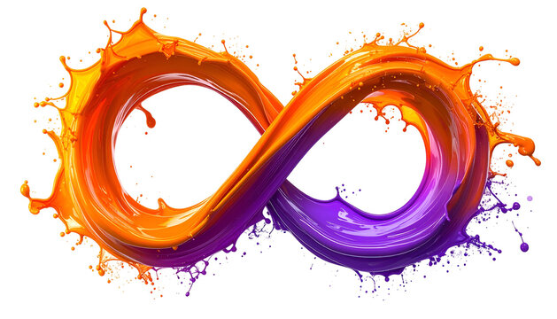 Vibrant infinity symbol rendered in vivid orange & purple liquids, with splashes