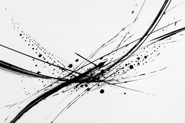 Abstract black ink strokes and splatters across a white background, creating a dynamic composition