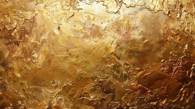 A close-up view of a textured, metallic gold paint surface. The paint has been applied in thick layers, creating a variety of peaks and valleys. Light reflects off of the surface, creating a shimmerin