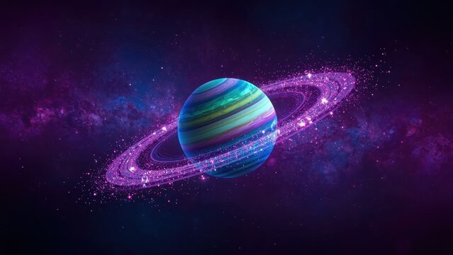 A vibrant, multicolored planet with rings, glows brilliantly amidst a vast, purple-toned cosmos.