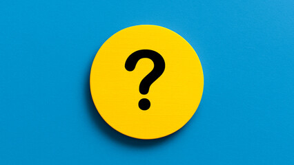 Round wooden circle painted bright yellow with a bold black question mark in the center, placed on a clean blue background, ideal for creative design concepts, FAQ icons, or curious digital graphic el