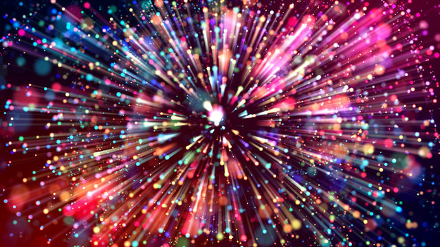 3d abstract beautiful background with light rays colorful glowing particles, depth of field, bokeh. Abstract explosion of multicolored shiny particles or light rays like laser show.