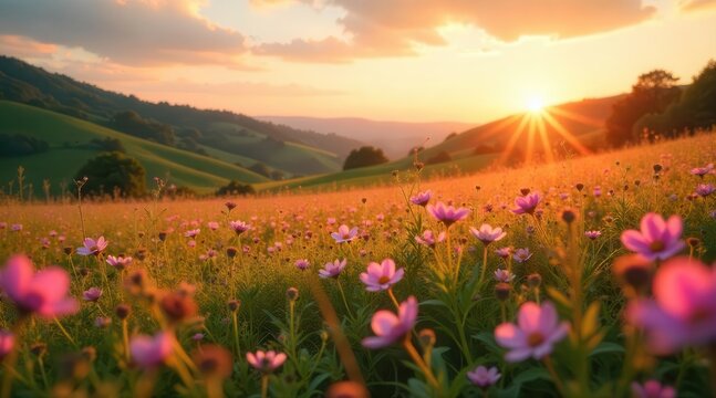 Golden rays illuminate a tranquil meadow blanketed in delicate blooms beneath a sky painted with sunset hues and soft clouds