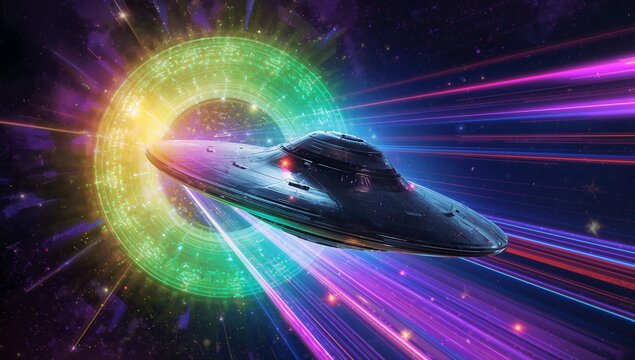 Flying disc-shaped spacecraft entering energy portal ring in outer space, with multicolored beams