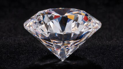 Brilliant transparent faceted diamond refracting multicolored light, displaying exquisite luxury sparkle, clarity and radiance on black velvet backdrop, highlighting its precious gemstone quality.
