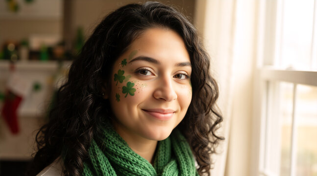 Portrait of a smiling young woman with shamrock face paint. Happy girl wearing a green scarf celebrating St. Patrick's Day