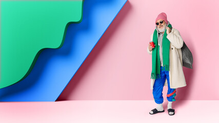 A man with stylish glasses and a thick, multicolored scarf poses confidently, showcasing a fashionable look amidst a softly blurred background, creating an artistic atmosphere
