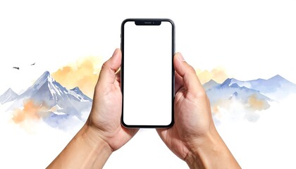 A person's hands hold a smartphone with a blank screen against a watercolor painted mountain background