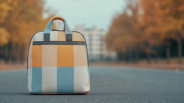 A large colorful bag with a pattern of multi-colored squares stands on the road in the park.