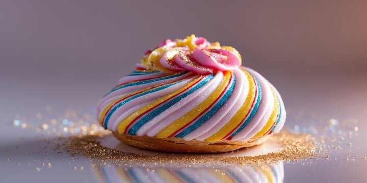 Pastry with multicolored cream stripes and edible glitter sprinkles on shine background