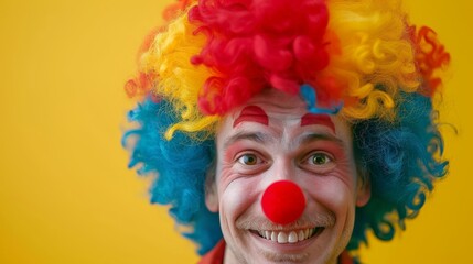 Colorful young caucasian male in clown costume with multicolored wig and sunglasses.