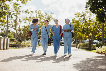 Standing multicultural medical team wearing lab coats and scrubs in hospital corridor