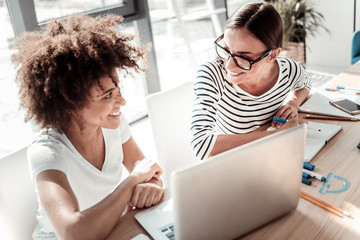 Pleasant partnership. Joyful nice pleasant women looking at each other and smiling while sitting in front of the laptop