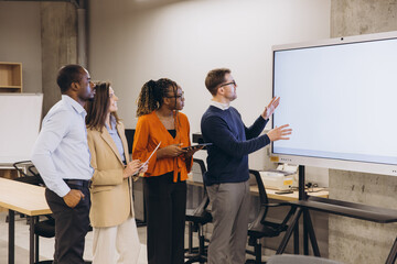 A diverse team of professionals collaborates in a modern office while analyzing data on a large digital screen