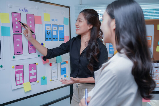 Two asian ui/ux designers are discussing the user interface of a mobile application while pointing at a whiteboard covered with sketches and mockups