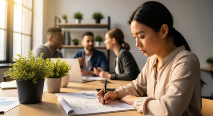 Two asian ui/ux designers collaborate on a mobile app layout, showcasing teamwork and creativity in an office setting