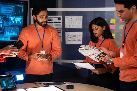 A diverse creative team is collaborating in a control center. Reviewing UI, UX wireframes and color palettes to solve a critical design problem for a new product. Project meeting and brainstorming
