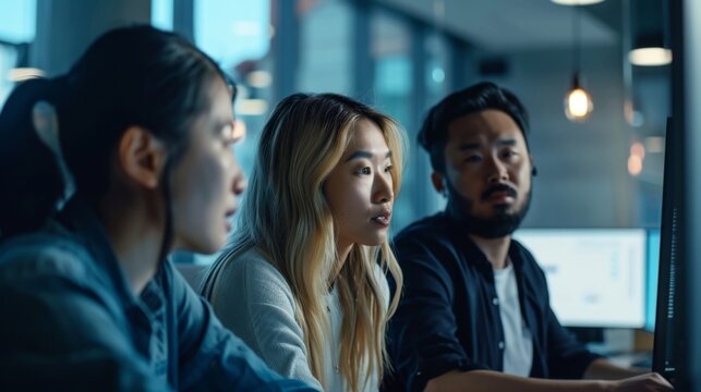 A diverse group of young professionals intently analyzing data on a computer screen in a corporate office setting, reflecting teamwork and dedication.