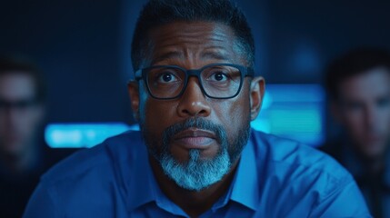 Team discussing vr development with code overlays in glass conference room, collaboration