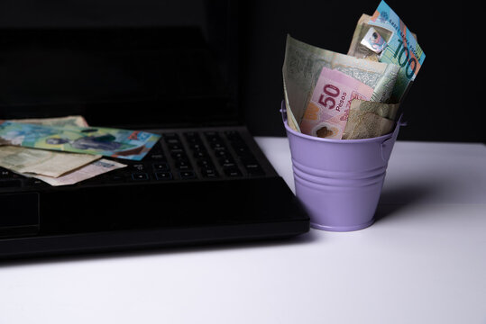 Piggy bank, bills, money in a bucket. Earned income from online business