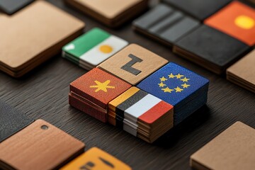 Linked blocks bank and currencies money bags. Financial system, national foreign exchange reserve concept. Attraction of credit resources on capital markets. Currency exchange and multicurrency cards.