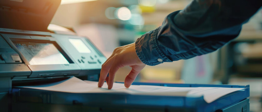 A person is using the copy machine to make a printed document, close-up of hand and printer with paper in office background