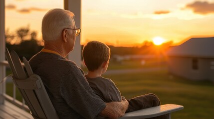 multigenerational family enjoys quiet moment together, watching sunset. warm glow of evening sun creates peaceful atmosphere, highlighting bond between older and younger generations