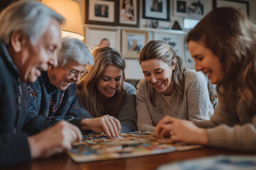 A multigenerational family, including seniors and younger adults, happily working on a puzzle together at a table in a cozy home setting