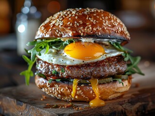 Rustic farmhouse burger with beef patty, cheddar cheese, fried egg, and arugula, on a toasted multigrain bun