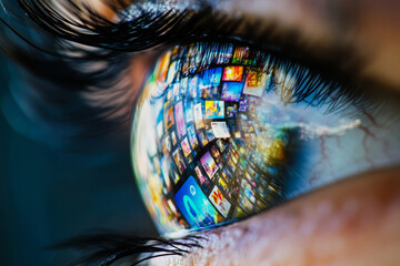 Woman's eye reflecting grid of social media feeds and pictures . Concept of online content consumption and technology influence
