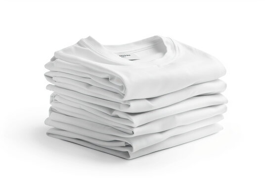 Neat stack of plain white t-shirts on a white background, symbolizing simplicity and versatility in fashion.