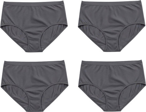 Four identical pairs of dark grey womens underwear neatly arranged.
