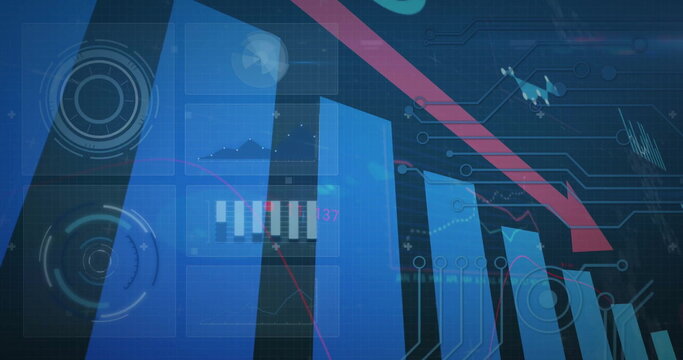 Image of loading circles, changing numbers, arrow on falling graphs over abstract background
