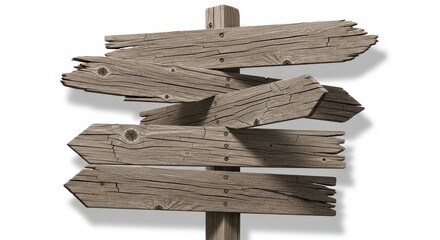 Old wooden directional signpost with multiple weathered planks pointing in different directions, isolated on white background
