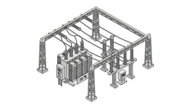 A 3D rendering of a transformer substation with multiple transformers and cables.