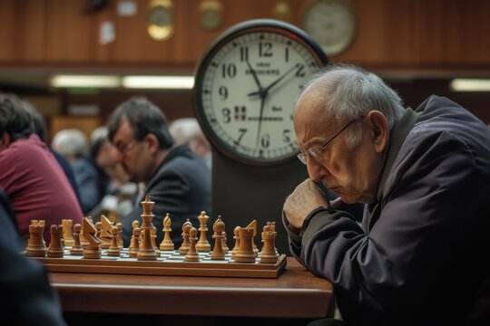 A chess tournament scene with games happening simultaneously, participants deeply focused on their boards, judges observing closely, and a large clock ticking down the seconds as tension rises.