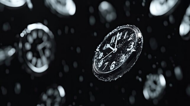 Time flies; multiple clocks in mid-air, suggesting the passage of time.  Water droplets surround them, highlighting the ephemeral nature of moments