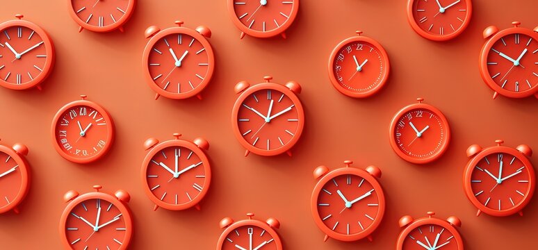 Many red alarm clocks on a red background. The clocks all show different times. A concept of time and deadlines.