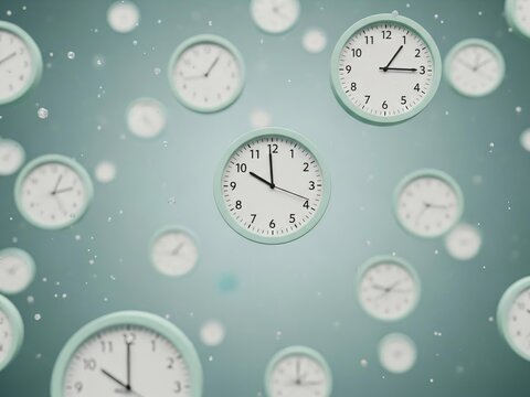 time management concept with multiple analog clock faces arranged on a clean white surface representing precision deadlines and strategic business.