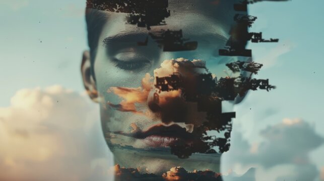 A surreal self-portrait with the face divided into multiple floating fragments.
