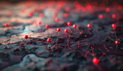 A close-up of red pins on an interactive map, each pin representing different global locations connected by thin lines.